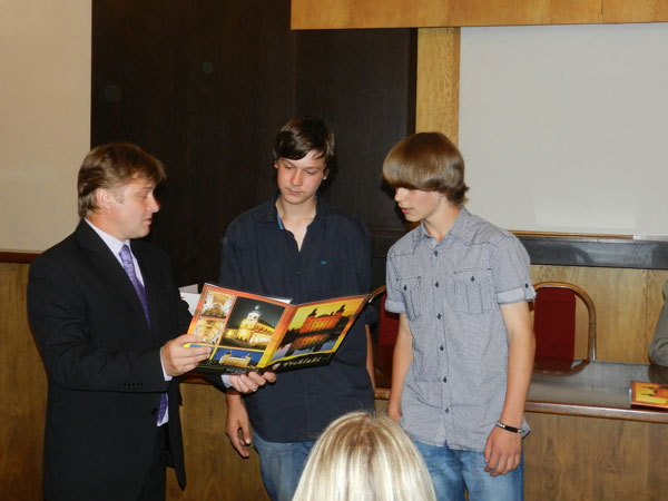 Starosta Jan Sobotka oceňuje dva zachránce lidského života. Žáci deváté třídy ZŠ Liščí kopec Ladislav Erben a Luboš Srnský zachránili život třiadvacetiletému muži, který si 11. dubna 2012 chtěl u rybníka Kačák vzít život oběšením. Stateční kluci zachovali klid, obezřetnost a k muži, jenž už byl v bezvědomí, zavolali záchranku.